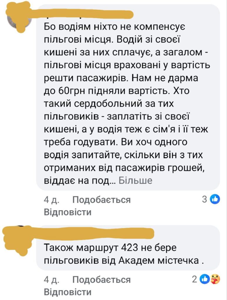 «Через пільговиків всередньому в день водій недоотримує 1000-1200 грн. Серед пільгових категорій – багато УБД, людей пенсійного віку, багатодітні сім’ї. За законом пільги діють для певних категорій, втім контроль за цим відсутній.