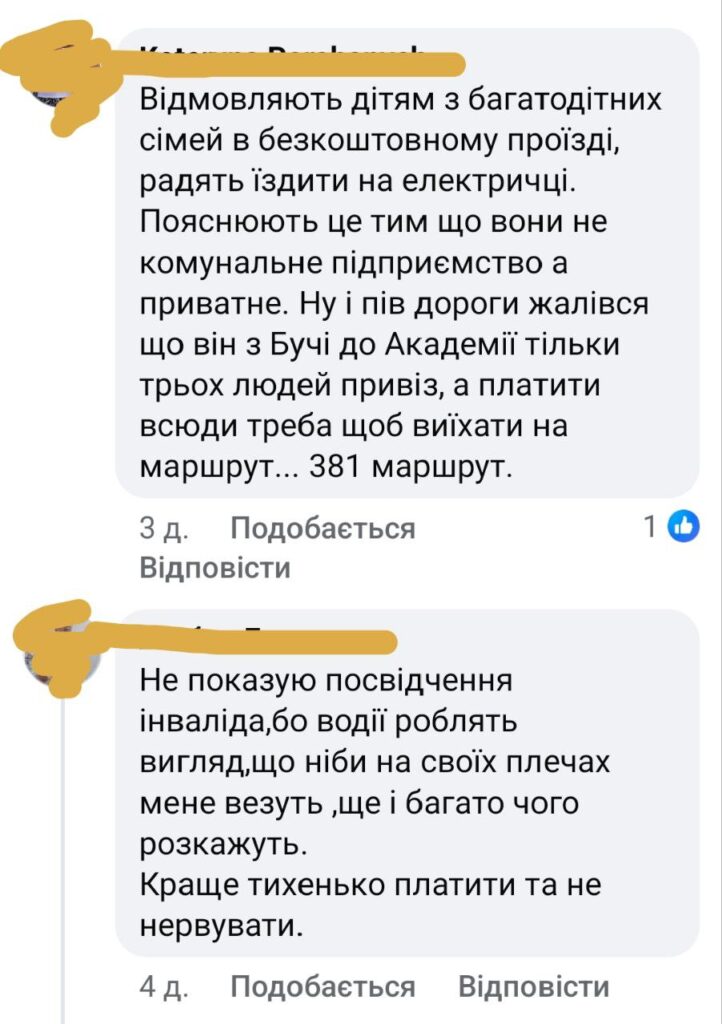 Крім того водій, звертає увагу на пасажирів охочих безкоштовно їздити, які використовують фейкові посвідчення. Через що водій може потрапити у коло осуду інших пасажирів, коли чекає на оплату за поїзд від людини з недійсним документом на пільгу.