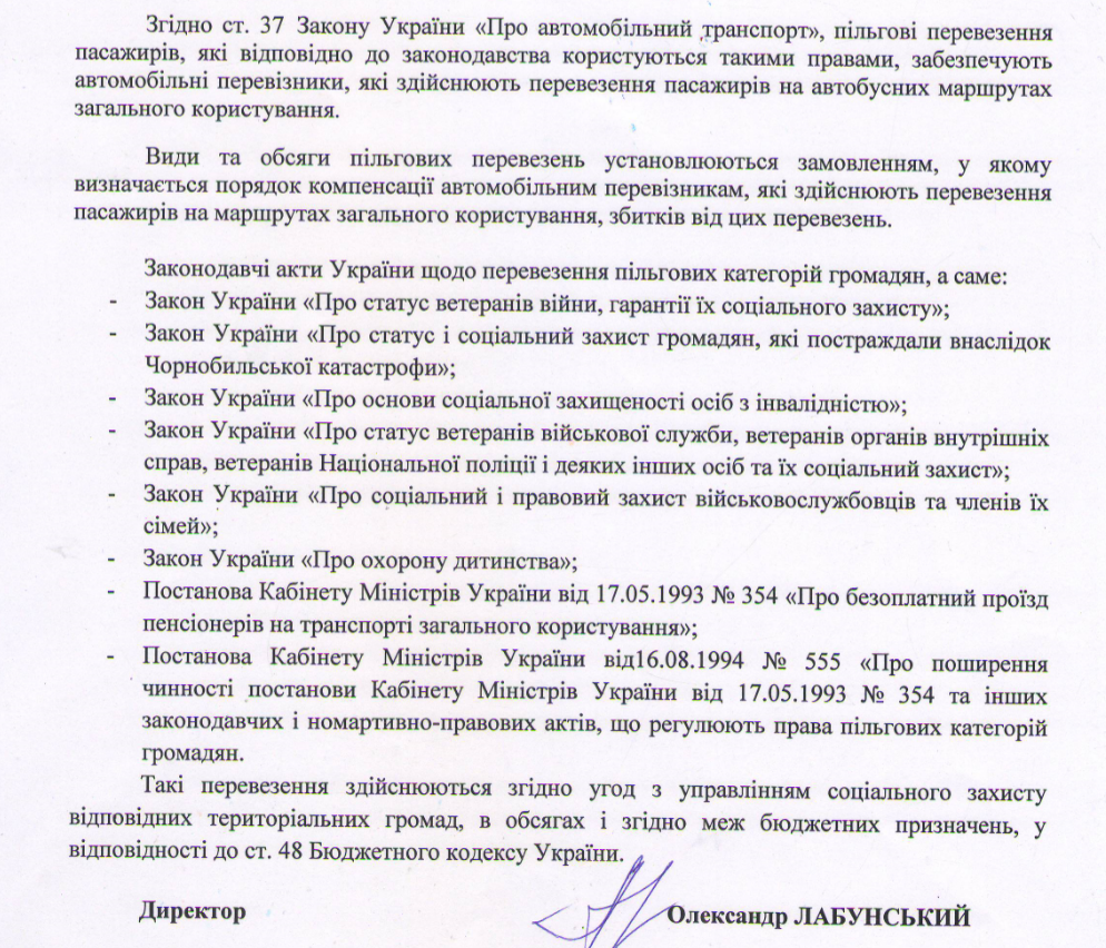 На що отримали відповідь із переліком законів, згідно з яких мають пільговий проїзд. Також в Ірпінському АТП зазначили, що види та обсяги пільгових перевезень установлюються замовленнями, що компенсують ці витрати.