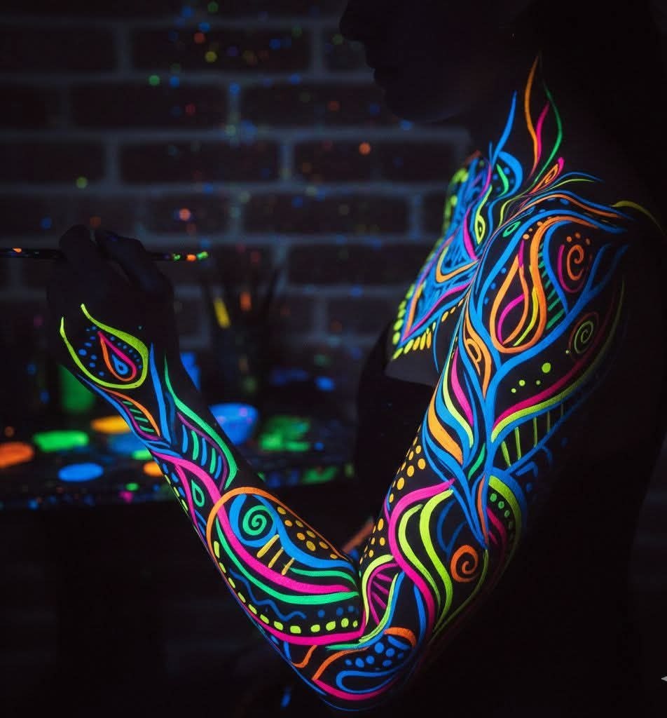 Такий вид арт-терапії допоможе вимкнути тривогу, вивільнити емоції без слів та соціалізуватись з учасниками через малювання флуоресцентним аквагримом на тілі.