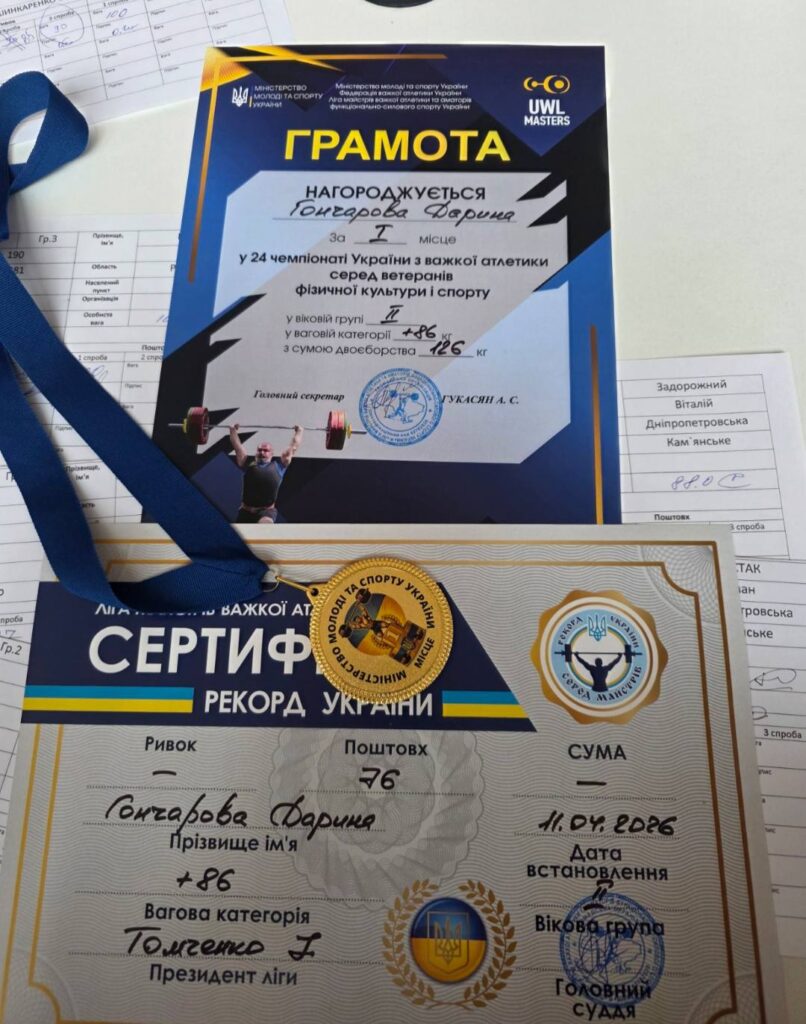 У категорії ветеранів фізичної культури та спорту Дарина продемонструвала блискучий результат – виборола три золоті медалі у своїй ваговій категорії та встановила новий рекорд України у вправі «поштовх» (76 кг).
