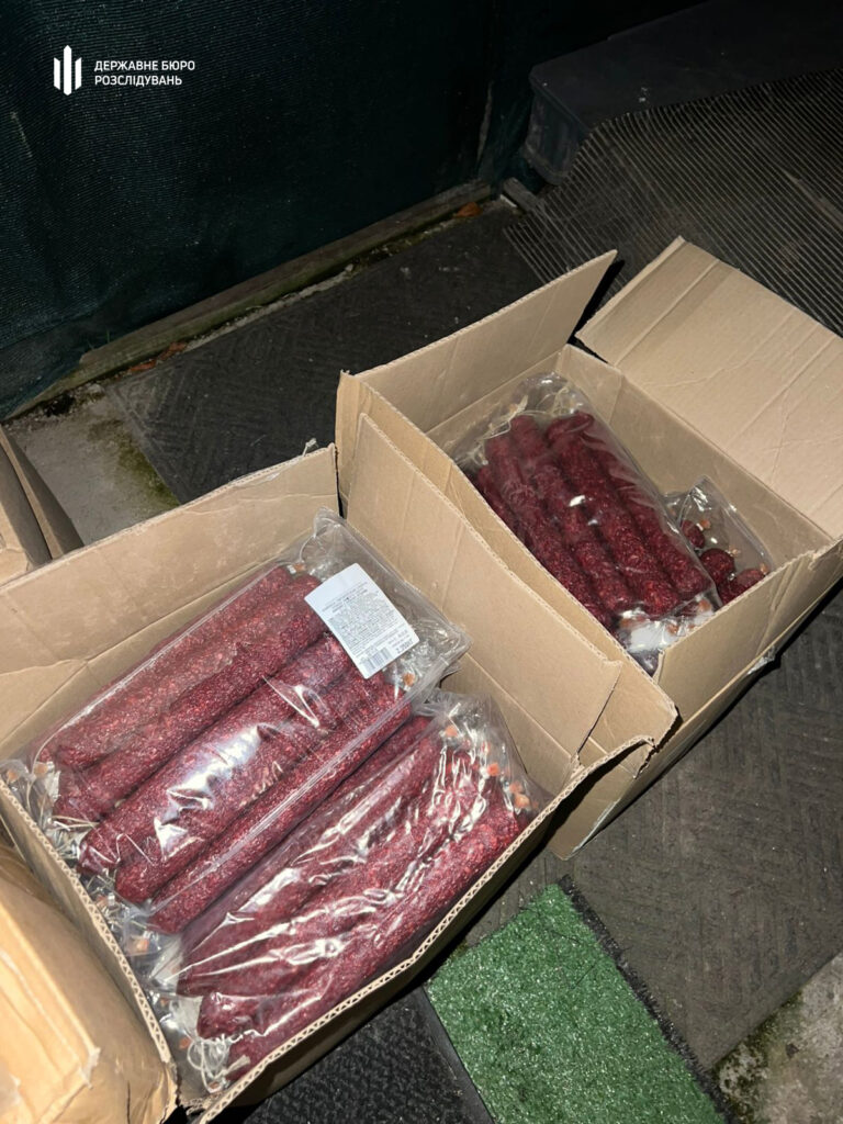Під час обшуку вилучили понад 600 кг м’яса, 80 кг риби, 60 кг ковбаси, 110 кг сиру, 12 кг масла та інші продукти на суму близько 160 000 грн. На місці було затримано начальницю їдальні, інструктора та водія.