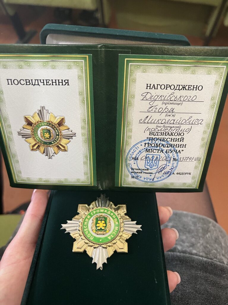 1 березня 2023 року був нагороджений званням «Почесний громадянин міста Буча» (посмертно).