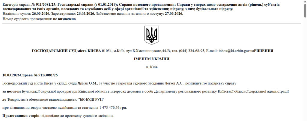 Господарський суд Києва задовольнив позов прокурорів щодо стягнення понад 1 470 000 грн з фірми, яка займалася відновленням житлового будинку в Бучі, пошкодженого під час бойових дій.