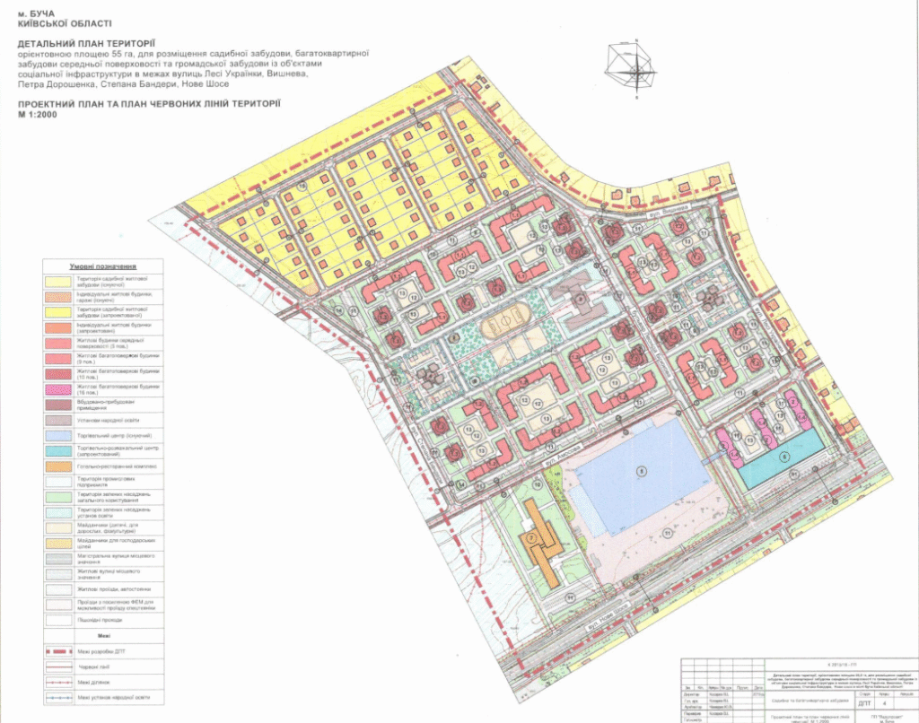 За інформацією секретаря Бучанської міської ради Тараса Шаправського, згідно з Генеральним планом Бучі (рішення міської ради №2124-67-VI від 17.03.2015 року) та Планом зонування міста (рішення №2171-69-VI від 30.04.2015 року), у цьому районі передбачене розміщення школи та дитсадка.