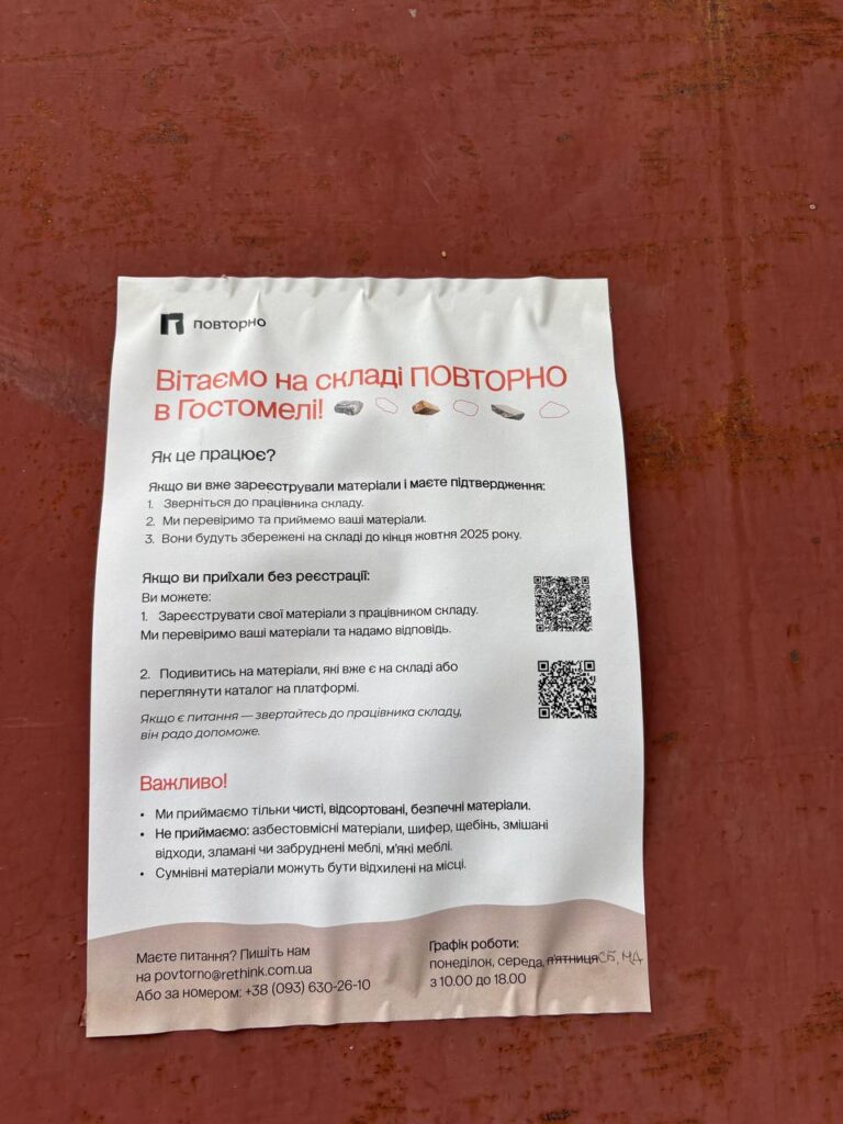 У Гостомельській громаді запрацював склад «Повторно», де будівельні матеріали, меблі та речі для дому знаходять нових власників. Тут можна зберігати, обмінюватися та знаходити необхідне для ремонту чи господарства – замість того, щоб викидати.
