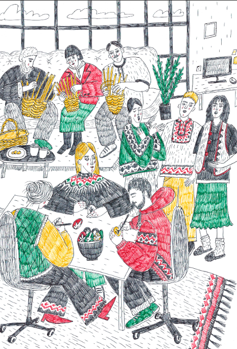 Головними символами свята є Паска та Крашанки. У гайді наголошують: якщо є можливість, спробуйте спекти паску саме вдома. Аромат дріжджового тіста, ванілі та цукатів, що розноситься квартирою – це найкращий «заспокійливий» засіб. Він миттєво створює відчуття безпеки та справжнього домашнього затишку, якого нам так бракувало. Хоча цікаво те, що раніше на Київщині була популярною саме солодка сирна паска. Звичка оздоблювати верхівку білковою глазур’ю і кольоровою посипкою прийшла до нас на початку ХХ сторіччя. Натомість більш давньою практикою є прикрашання верхівок геометрично-рослинними орнаментами з тіста або християнськими мотивами.
