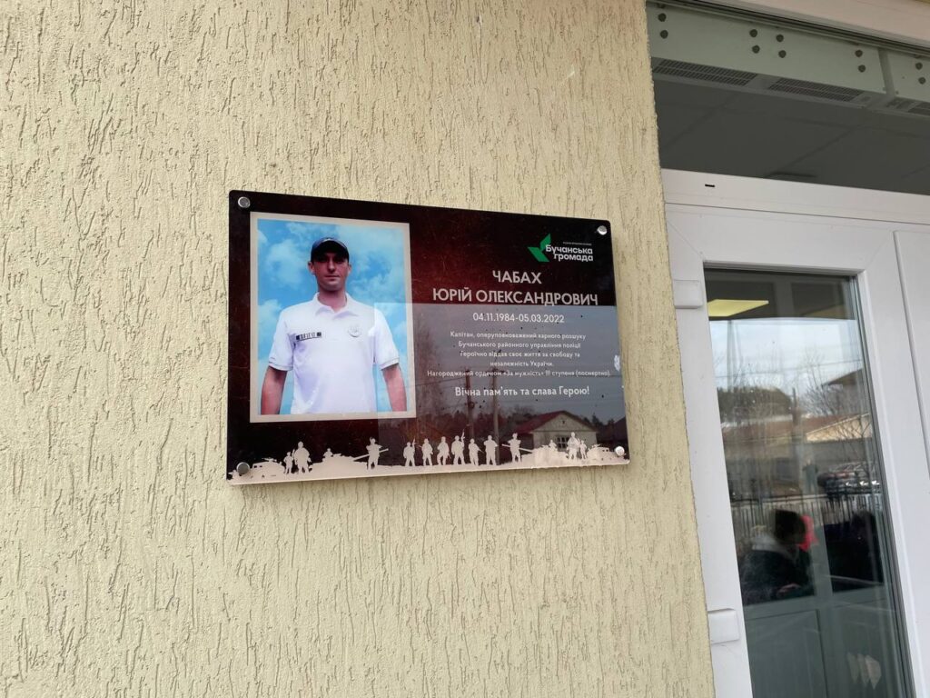 5 березня 2024 року у другу річницю загибелі, на вході Бучанського ліцею №9 відкрили дошку капітану Національної поліції України Юрію Олександровичу Чабаху.